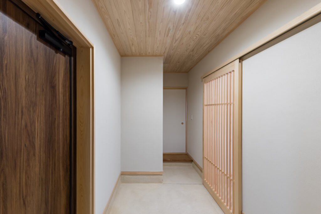 玄関(写真左のドア)をあけるとLDKへつながる格子建具と、奥には「離れ」の和室のふすま。シラスたたきで土間空間もタイルなどに比べると比較的あたたかい。