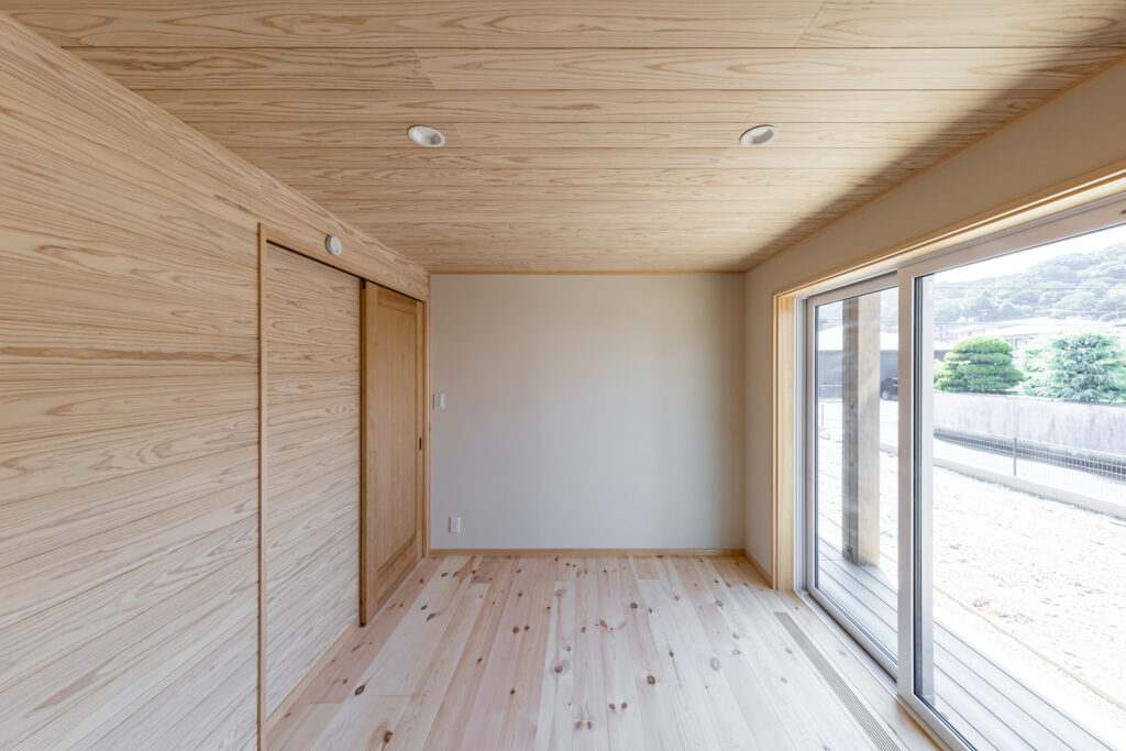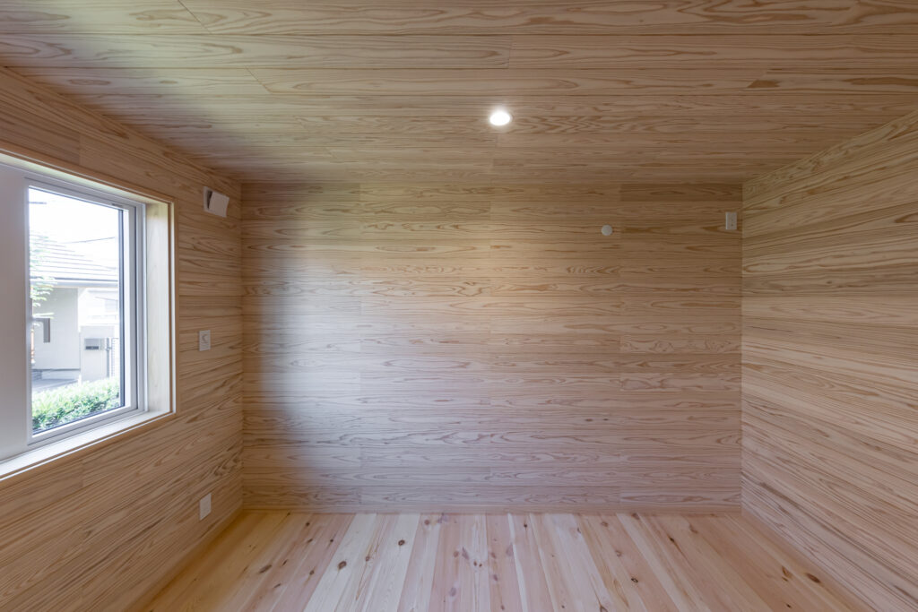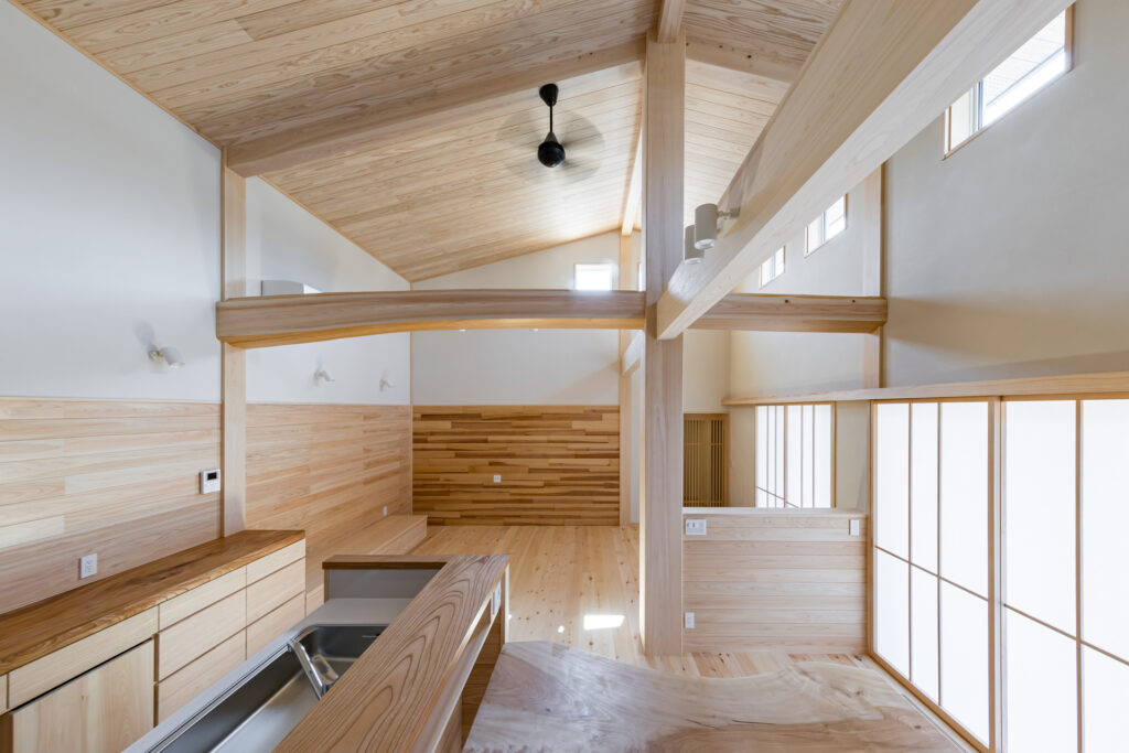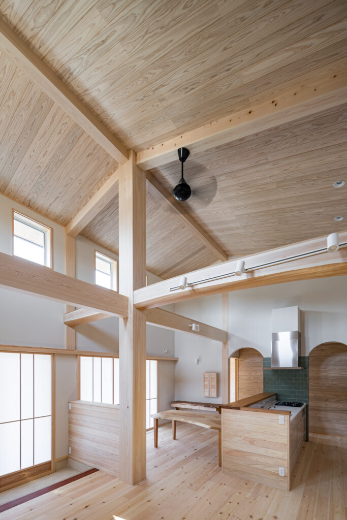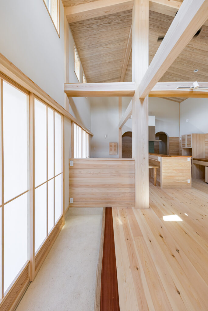 室内もあまり細かく区切らず大きな空間としてとらえており、大空間に柱や梁がしっかりとした木の家であることを証明している。