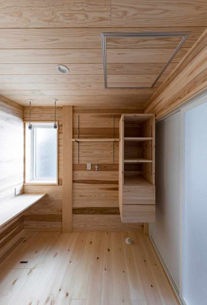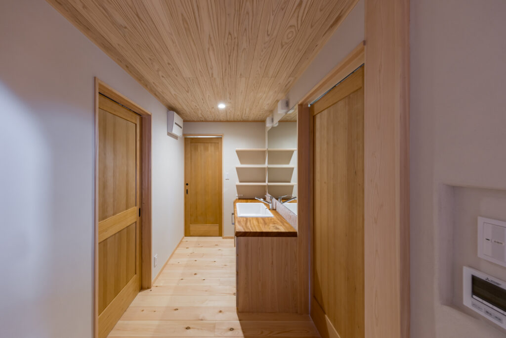 脱衣室兼ランドリースペース。アイロンカウンターも設置して使いやすい。内装の無垢板仕上げは一年中カラッとしてカビとは無縁の空間。