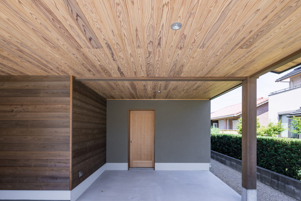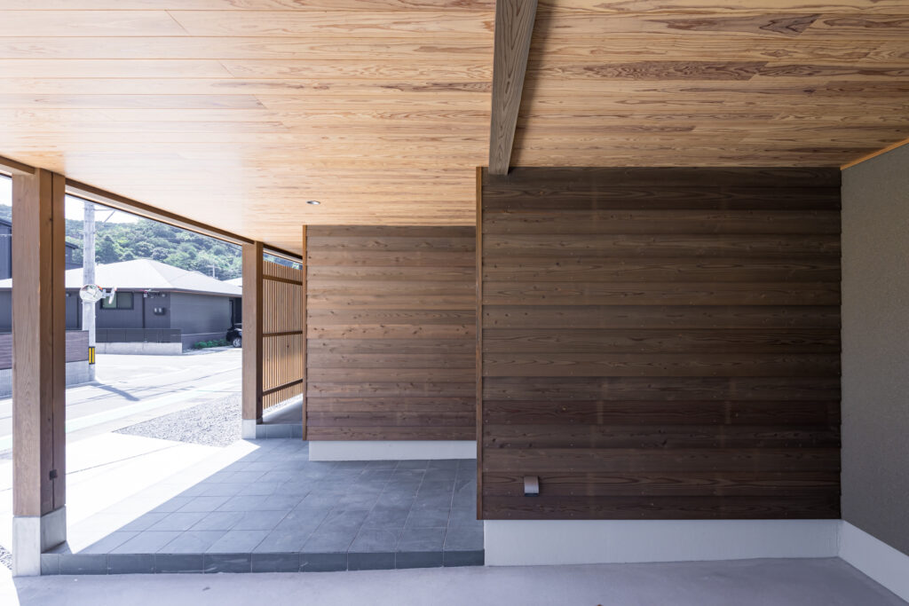 車寄せを兼ねた大きな屋根のエントランスは奥に外物置も備え使い勝手抜群。